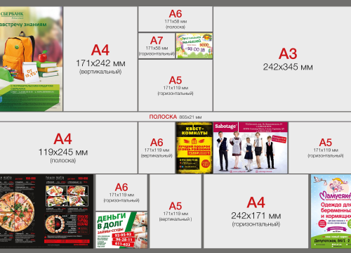Дополнительно необходимо отметить, что формат рекламы в лифтах в Тутаеве является одним из основных факторов, влияющих на стоимость. Так, рекламные листовки бывают различных форматов: А1, А2, А3, А4, А5, А6. Чем меньше формат, тем ниже цена. Вариативность форматов рекламы позволяет рекламодателям даже с небольшим бюджетом размещать рекламу в лифтах и сообщать населению о продаваемых товарах и оказываемых услугах.
